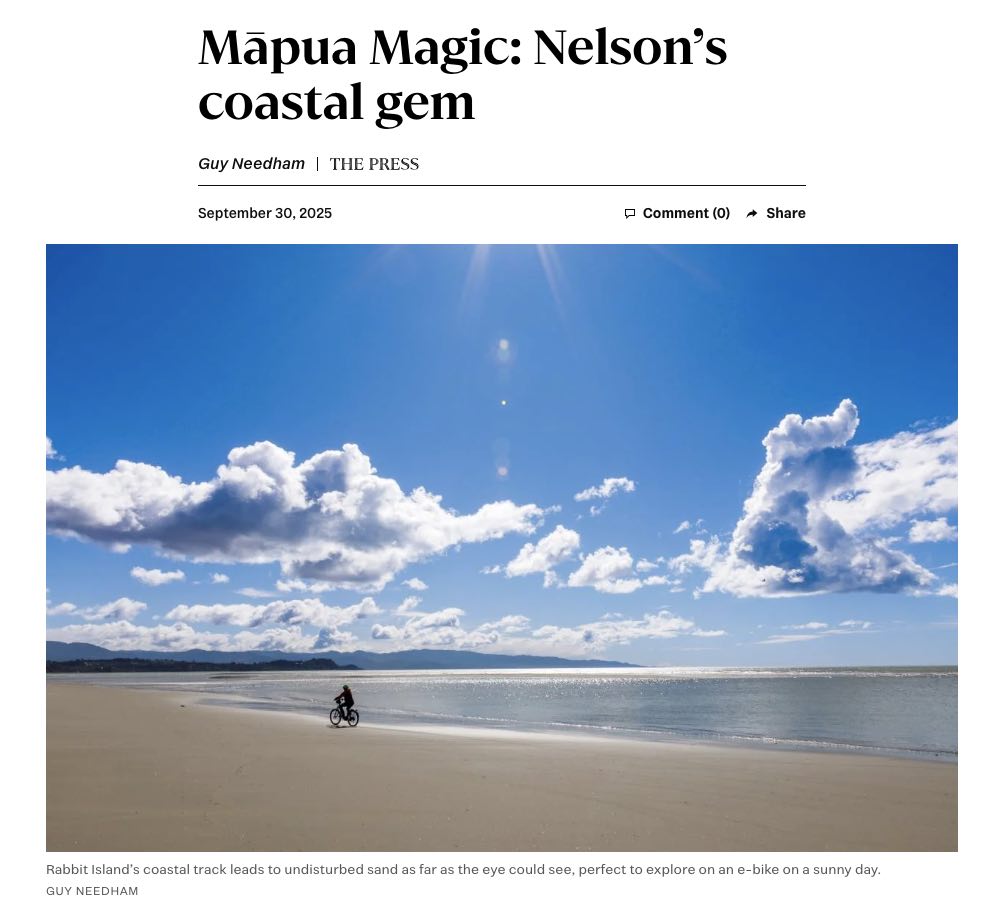 We were thrilled to be featured in Stuff this month as part of Guy Needham’s Māpua Magic travel story. During his visit to Nelson, the renowned journalist and photographer joined our CEO, Chris McCormack, for a night tour — and was treated to an unforgettable encounter with a kiwi pukupuku just metres from the track.