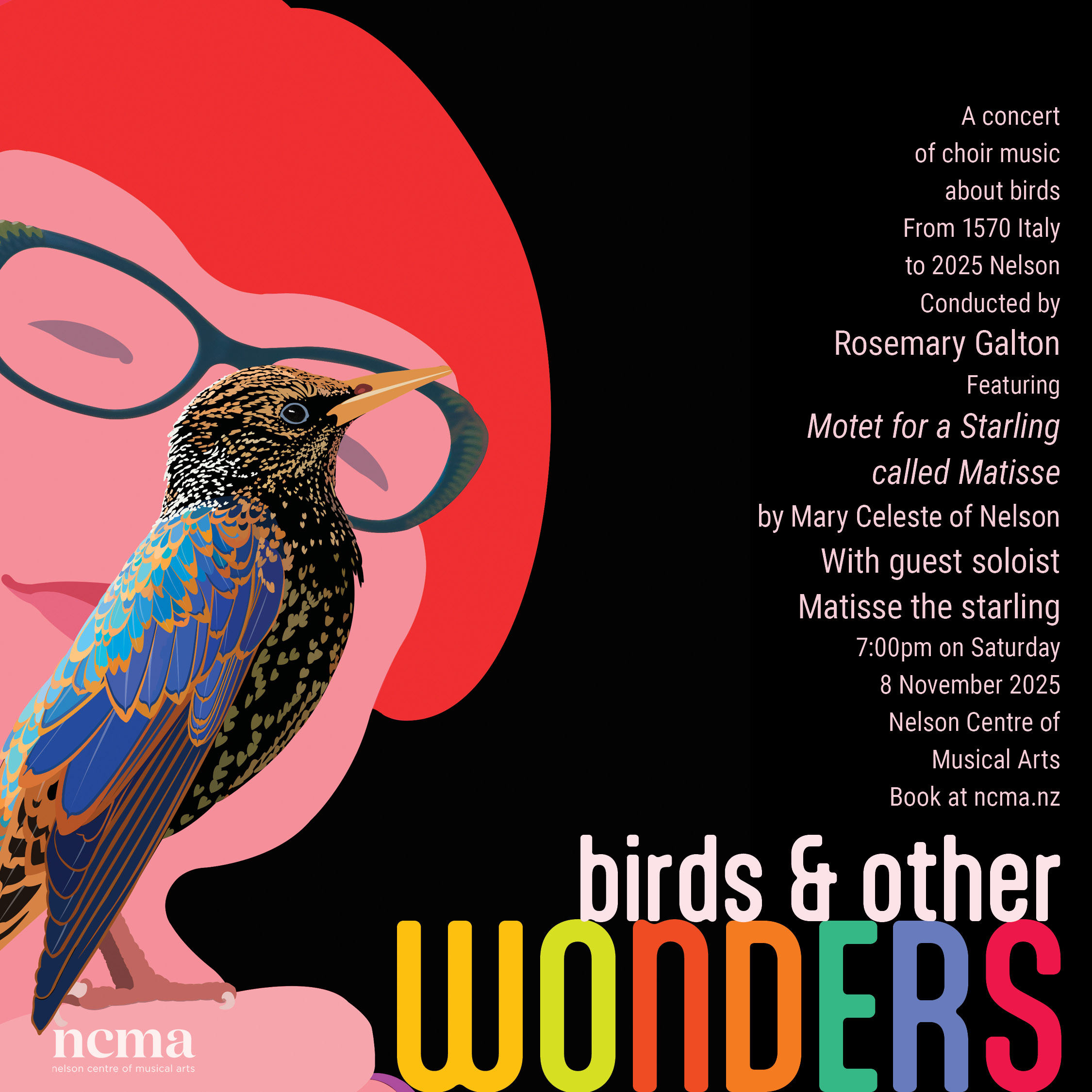 Join us for a magical evening of music and nature at the Nelson Centre of Musical Arts (NCMA), 48 Nile Street, on Saturday 8 November at 7pm! This unique concert, conducted by Rosemary Galton, celebrates birds, the cosmos, and our connection to them — with a special guest: Matisse the starling! Hear the world premiere of the recently completed Motet for a starling called Matisse by Nelson composer Mary Celeste, featuring Matisse on stage as a soloist alongside a choir of 17 singers and instrumentalists. Programmed with stunning music from the Renaissance to the present day, including five other pieces by Aotearoa composers. Don't miss this one-of-a-kind performance! .